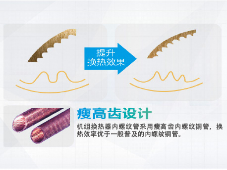 TURBO-B蒸發(fā)管,制冷劑在管路內(nèi)壁形成液膜,針對不同傳熱機(jī)理、流體介質(zhì)設(shè)計的特殊換熱表面,提高了殼管換熱效果,同時降低沿程流動壓力損失,減小機(jī)組能耗。